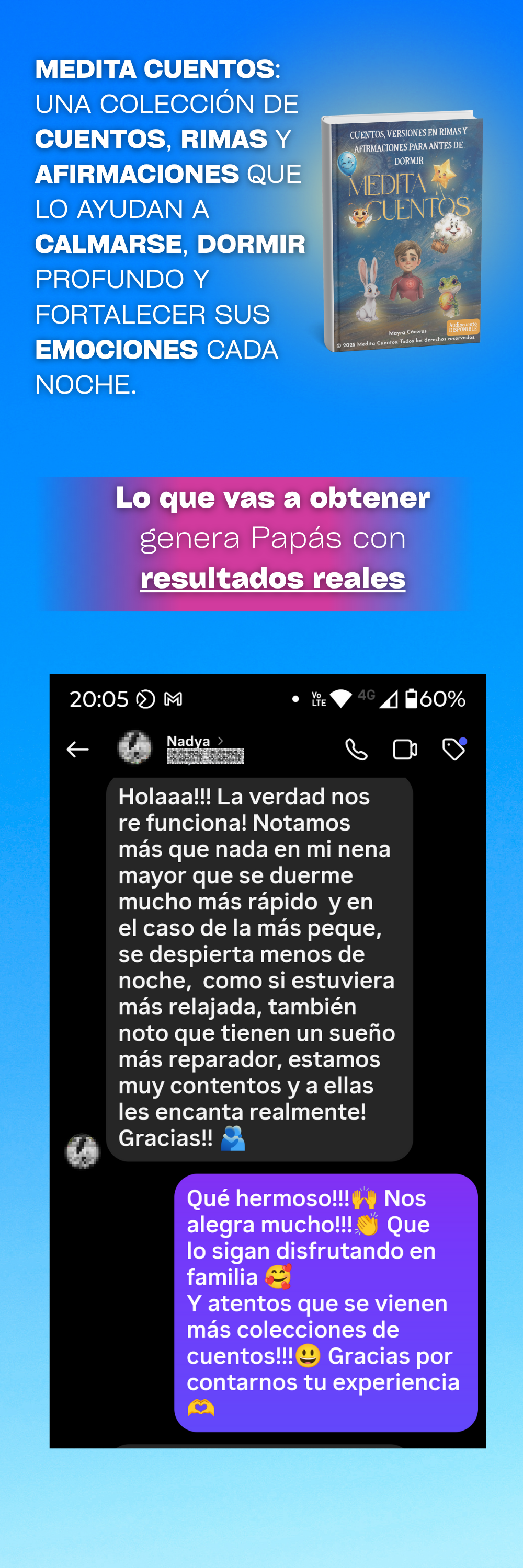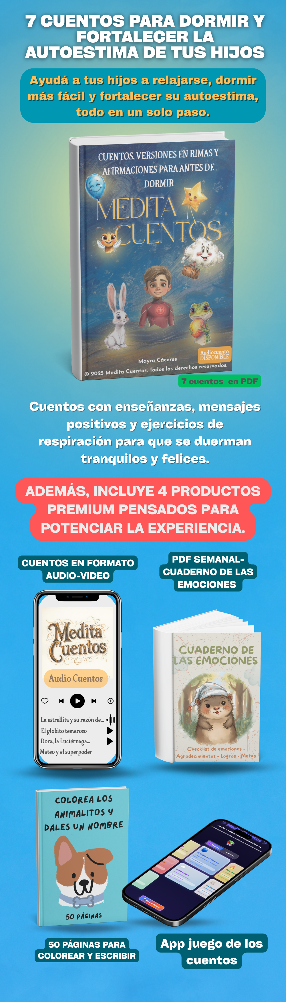 Una colección de 7 cuentos mágicos, uno para cada día de la semana, diseñada para ayudar a los niños a relajarse, fortalecer su mundo emocional y dormir tranquilos. Cada historia tiene un personaje único, una lección especial, una versión en rima y respiraciones guiadas junto con afirmaciones, ideal para acompañar la rutina diaria de tu hijo de manera entretenida y educativa.